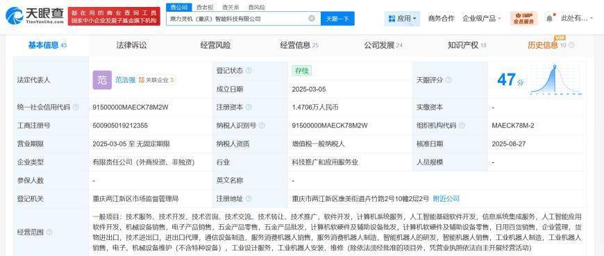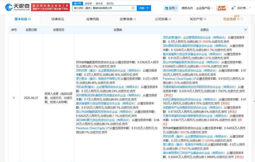 原力灵机(重庆)智能科技有限公司成立于2025年3月,法定代表人为范浩强,经营范围含人工智能基础软件开发、信息系统集成服务、人工智能应用软件开发、企业管理、服务消费机器人制造、智能机器人的研发、智能机器人销售等。股东信息显示,该公司现由原力聚合(重庆)信息技术有限公司、灵机启原(重庆)企业管理咨询合伙企业(有限合伙)、灵机拓原(重庆)企业管理咨询合伙企业(有限合伙)及上述新增股东等共同持股。