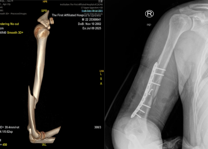 伴随着这声异响,一阵钻心的剧痛从阿琦右臂传来,他瞬间败下阵来,冷汗直流。此刻,输赢早已无人关心。朋友们被这突如其来的一幕吓坏了,赶紧将阿琦送往浙江省中医院钱塘院区。急诊骨伤科医生查体后发现阿琦的腕关节手指背伸困难,诊断结果让所有人倒吸一口凉气:“右肱骨干骨折,合并桡神经损伤!”
