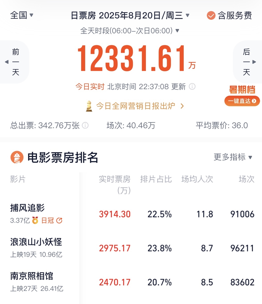 但《捕风追影》上映五天,口碑和票房都一路高歌,不仅豆瓣开出了8.1的成龙电影第二高分,票房上更是在上映的第三天反超在这个暑期档表现最为抢眼的《浪浪山小妖怪》和《南京照相馆》,成为日票房冠军,并已蝉联三日。